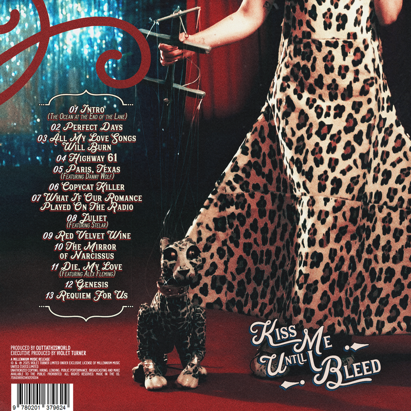 Em seu segundo álbum de estúdio, Violet Turner dá um salto artístico notável, trocando o impulso cru do debut por uma abordagem mais meticulosa, quase devastadora. Suas letras, melodramáticas, densas e cirurgicamente impactantes, revelam uma artista em pleno domínio lírico. É uma obra que equilibra vulnerabilidade e controle, beleza e desespero, inserindo Violet no radar como uma das artistas mais sofisticadas e inquietas da atualidade. Logo na faixa de abertura, Turner não apenas nos introduz ao universo emocional do álbum, ela nos arrasta para dentro dele. “Intro (The Ocean at the End of the Lane)” é um monólogo afogado entre o sublime e o autodestrutivo. A letra é brutal em sua honestidade e cinematográfica em sua estrutura: há um oceano, há uma mulher, e há uma promessa de dor que se transforma em desejo. Turner faz da melancolia uma forma de devoção, e da dor, um lembrete de que ainda se está viva. A transição entre o tom contemplativo e a explosão carnal (“Beije-me até eu sangrar”) revela, sem espaço para dúvidas, o porquê do título do álbum. É o ponto em que vulnerabilidade e violência se tocam, e Violet transforma o amor em um experimento físico, quase sacrificial. Em “Perfect Days”, Violet adota um tom mais narrativo, descrevendo um relacionamento marcado por intensidade e desgaste. A letra alterna entre lembranças íntimas e imagens violentas, equilibrando vulnerabilidade e ironia. Quando ela canta “Você costumava me chamar de Katrina”, há tanto afeto quanto rancor, uma metáfora que resume o caos emocional da faixa. Os dias perfeitos do título soam mais como um engano juvenil do que uma promessa cumprida. Turner compõe com frieza e clareza sobre o fascínio do amor destrutivo, sem se vitimizar nem se vangloriar. É uma canção sobre perda, mas também sobre reconhecer o próprio papel no colapso. Em “All My Love Songs Will Burn”, Violet abandona a grandiosidade das duas primeiras faixas e entrega sua composição mais frágil, talvez até desconfortavelmente honesta. A letra gira em torno de uma sensação persistente de vazio, tratada sem glamour e sem autocomiseração. É direta e possivelmente uma das letras mais humanas do álbum. “Highway 61” é outra composição narrativa, seguindo um eu lírico que cresce entre violência doméstica, omissão e religiosidade distorcida. A primeira estrofe contrasta a inocência noturna: estrelas, livros, leite quente, com a presença silenciosa de um “diabo” que simboliza abuso familiar e até sexual. O refrão transforma a estrada em fuga e renascimento, uma liberdade amarga, mas ainda assim liberdade. A segunda parte traz imagens diretas do trauma, incluindo a fantasia de um fim rápido. Na ponte, referências ao blues e ao mito da Rota 61 dão peso histórico à fuga, sugerindo que essa estrada sempre carregou almas partidas. O outro encerra com um fatalismo cru: a ideia de que o dano de infância molda tudo, inclusive a sensação de que não há futuro além da própria autodestruição. Em “Paris, Texas”, faixa colaborativa trabalhada como lead single do álbum, Violet e Danny Wolf constroem um diálogo erótico que mistura cinema noir, fetiche e fantasia de poder sem qualquer sutileza. A letra alterna entre imagens decadentes e um erotismo explícito que funciona mais como performance do que confissão. O eu lírico de Violet aparece entregando-se ao papel de objeto, enquanto Danny assume o controle com ironia e autoconfiança. O refrão, repetido pelos dois, transforma a metáfora da “boneca sexual” num gesto teatral, quase exagerado de propósito. A ponte é o momento mais interessante: Violet cruza referências a Paris, Texas com submissão física, dando à faixa uma camada melancólica em meio ao hedonismo. No geral, é uma música provocativa, estilizada e consciente do próprio exagero, mais estética do que emocional. É uma reflexão sobre a intensidade de querer e ser querido até os limites do corpo. Em “Copycat Killer”, Violet Turner leva o conceito do álbum — a necessidade de ser amado e a impossibilidade de se preencher — ao extremo mais perturbado e teatral. A letra constrói uma narradora que oscila entre confissão e fantasia stalker, explorando desejo como compulsão química e identidade como algo copiável, moldável, quase consumível. Há imagens fortes (“o mapa do meu coração é seu, marcado em vermelho”) e outras que flertam com o grotesco pop (“sentir o gosto do Prozac no seu suor”), criando um híbrido entre obsessão adolescente e erotismo farmacológico. A música funciona como um delírio narrativo: exagerada, autoconsciente, às vezes propositalmente desconfortável e, dentro da lógica do álbum, reforça o retrato de personagens que confundem ser amadas com existir. “What If Our Romance Played on the Radio?” transforma a fantasia romântica em transmissão pública — como se a protagonista precisasse que o mundo inteiro ouvisse seu amor para que ele finalmente existisse. É uma carta aberta mascarada de love song, onde o romantismo vintage (“la vie en rose”, o rádio chiando, a lua como destino) contrasta com a dinâmica explícita de submissão, violência emocional e física. Violet escreve o próprio abuso como se fosse uma performance pop, perguntando o tempo inteiro se a validação externa poderia consertar o que está quebrado por dentro. O resultado é desconfortante, autoexposto, quase desesperado. Dentro do projeto, a música funciona como tese e síntese: amar, para essa narradora, é uma tentativa de preencher o silêncio interno com qualquer som, até mesmo o chiado de um rádio tentando pegar sinal. “Juliet” é a faixa onde Violet transforma a tragédia romântica em ritual de autodevoração. A música, que é uma colaboração com a estrela da música alternativa Stelar, expande o tema central do projeto: amor como fome, ausência e desespero, levando-o ao seu extremo teatra