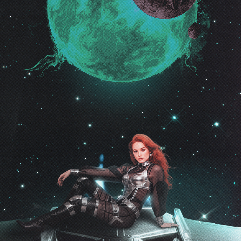 PRODUÇÃO VISUAL Adentrando de vez na estética distópica, o visual busca ambientar o álbum em uma narrativa futurista espacial, combinando elementos tribais e industriais, além de trazer referências sutis a universos como Star Wars, Duna e Mad Max. Aqui, outta assume a persona vilanesca proposta pelo trabalho, assumindo a imagem de uma antagonista complexa. Idealizado como uma ruptura estética em relação ao álbum original, mas ainda preservando traços de sua identidade e simbolismo, ALIENRIDE é como o Out Of This World em um universo paralelo. Com cores mais contrastantes, elementos não tão polidos e atmosfera soturna, o projeto invoca a essência do álbum pai, enquanto constrói sua personalidade nova e autêntica.